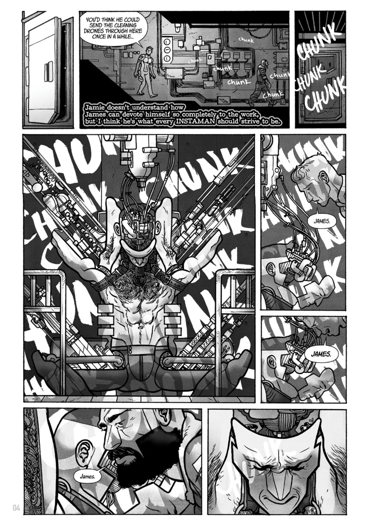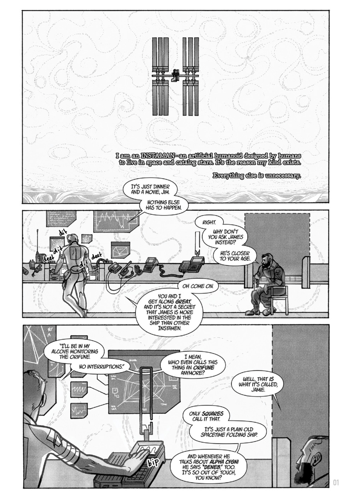 Jamie, James, and Jim are three JAMES brand Instamen who are struggling to reconcile their pre-programmed instincts with the inclinations they've developed with age when a malfunction in their spacetime-folding ship threatens to alter their priorities.